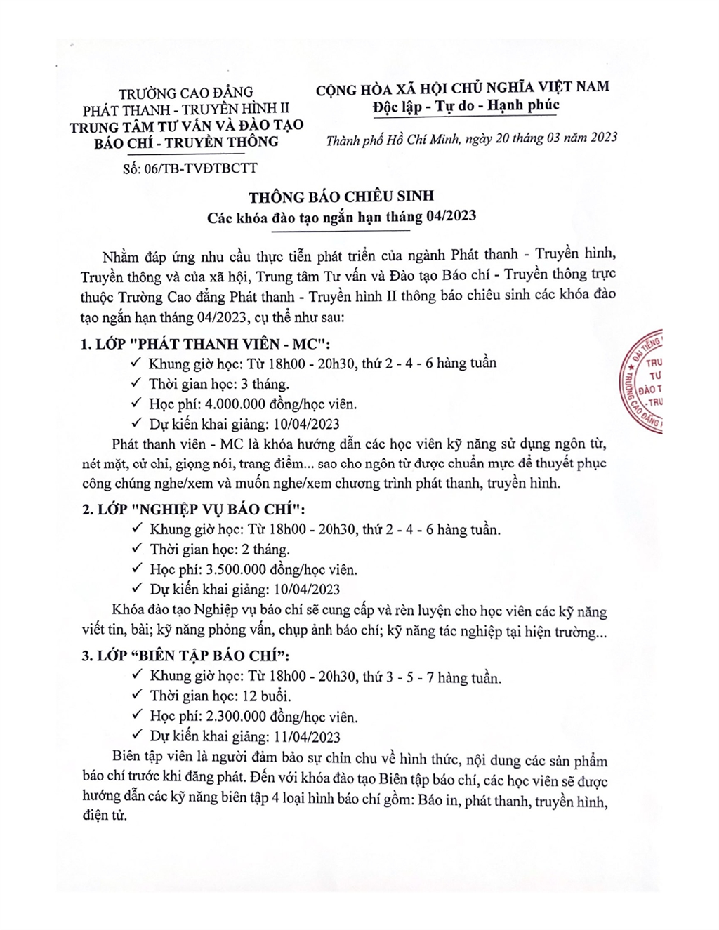 - 20.03.2023Thông báo chiêu sinh các khóa đào tạo ngắn hạn tháng 04/2023