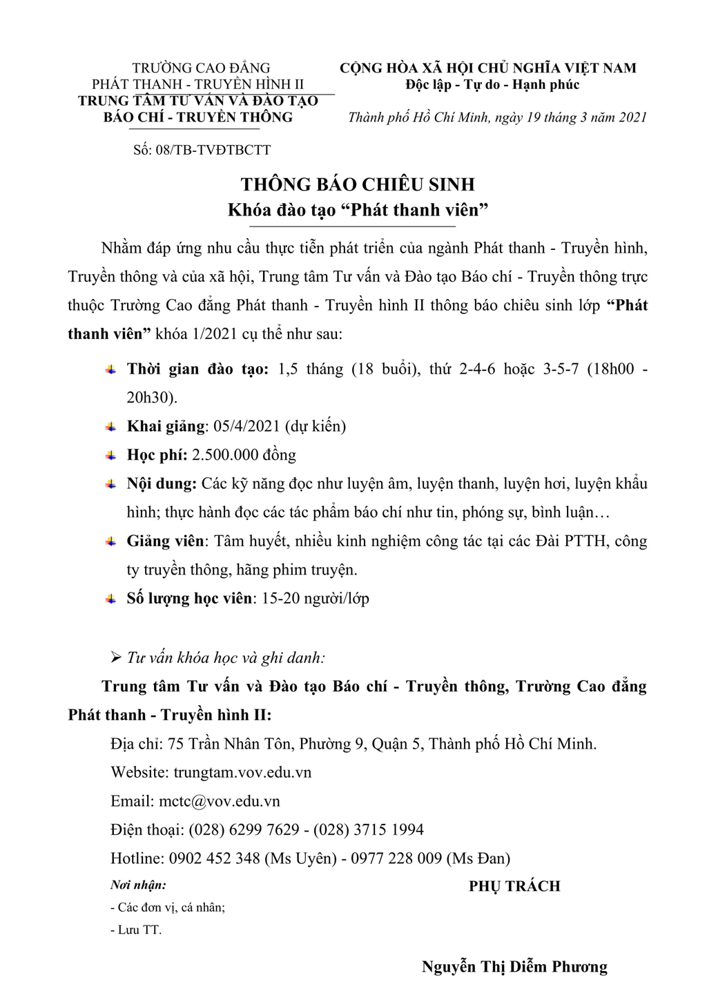 THÔNG BÁO CHIÊU SINH Khóa đào tạo “Phát thanh viên”
