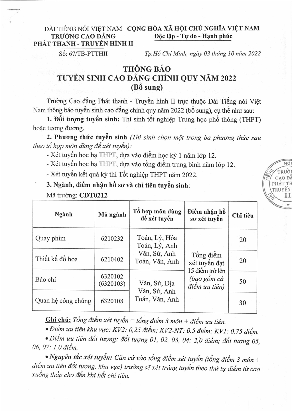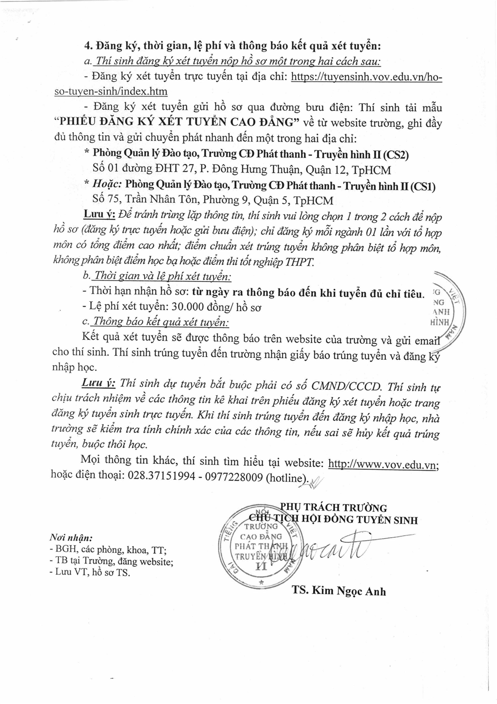 + Hoặc: Phòng Quản lý Đào tạo, Trường CĐ Phát thanh - Truyền hình II (CS1)